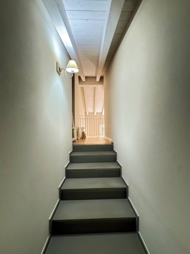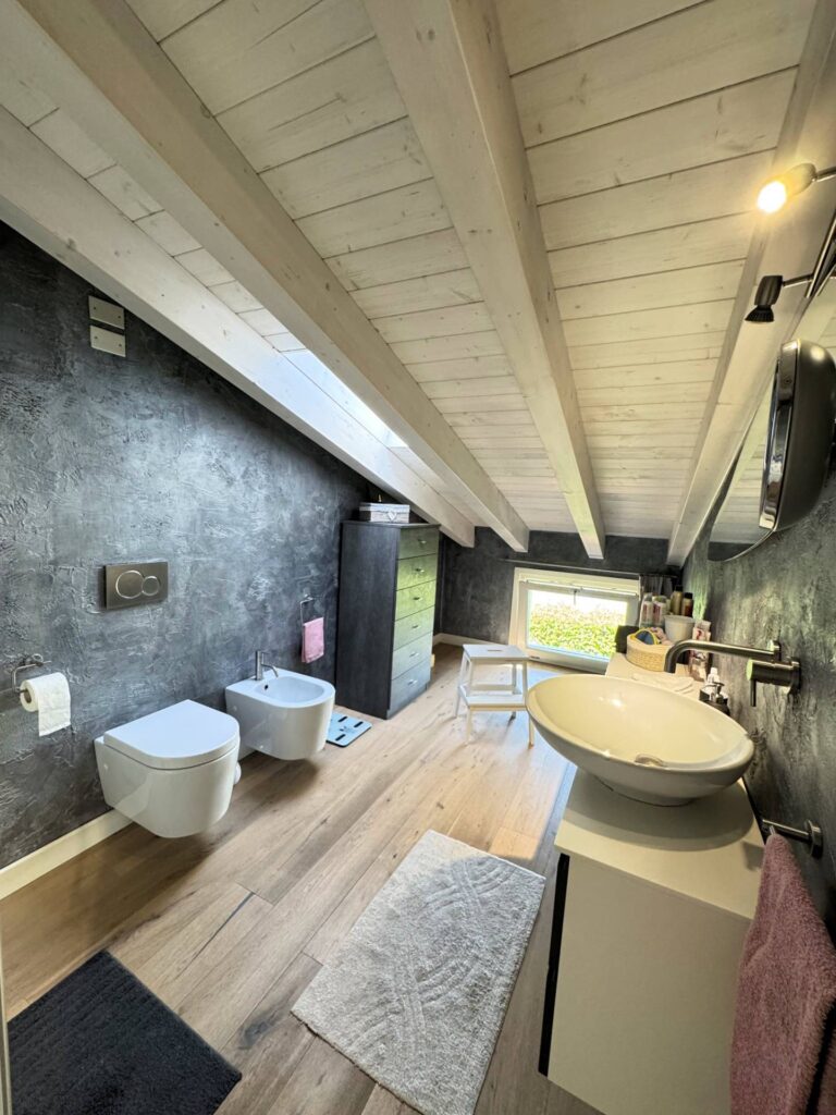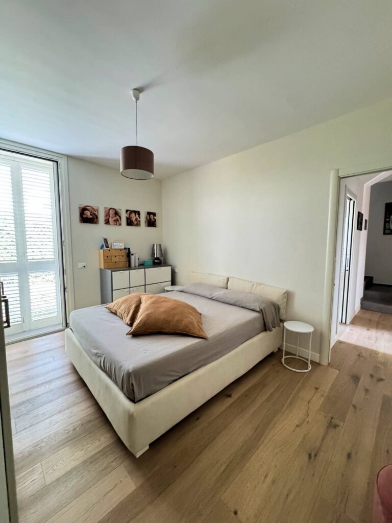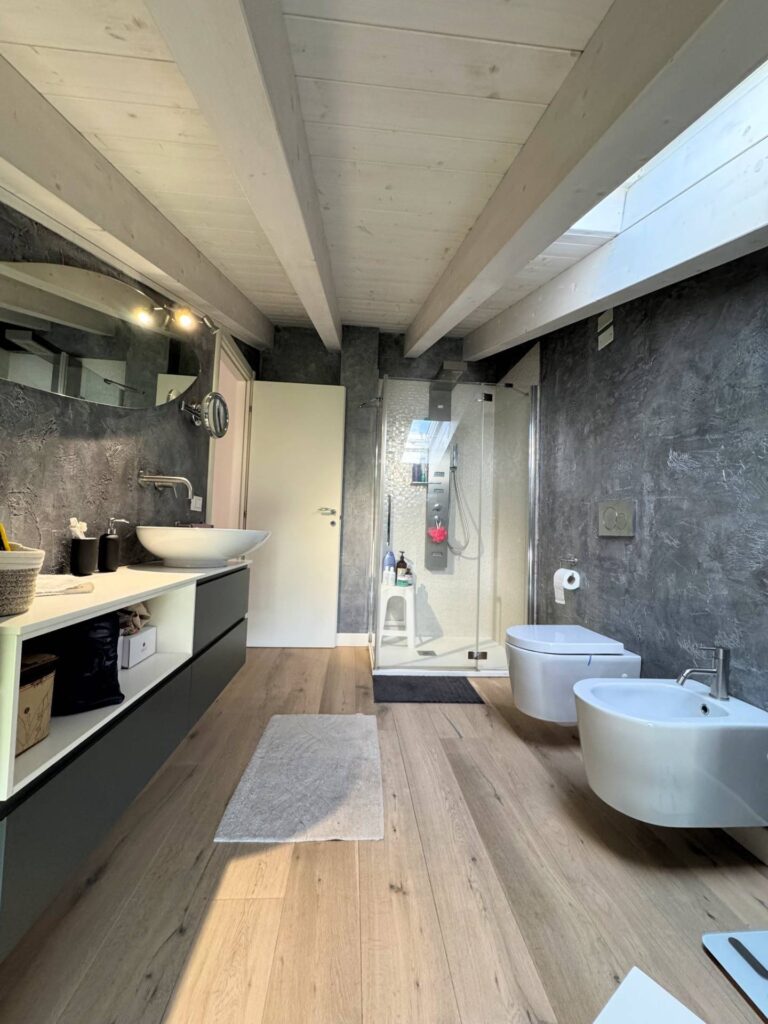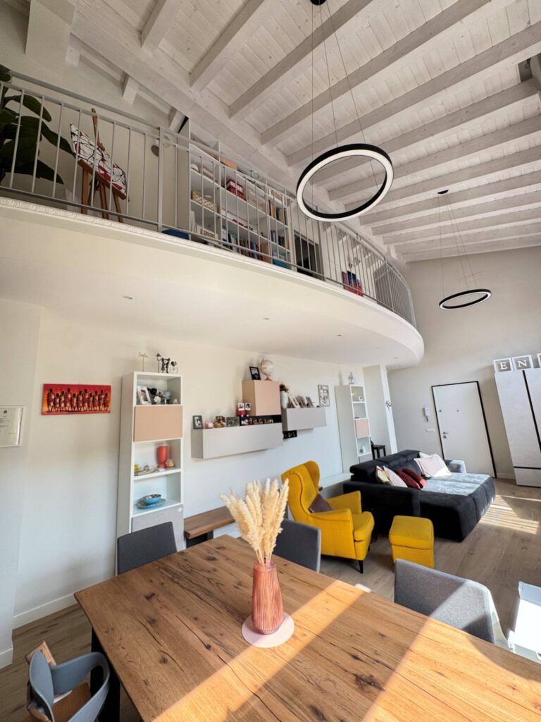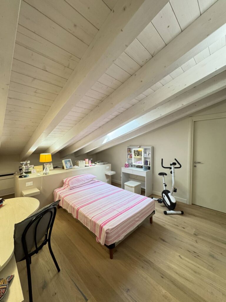 Piano Superiore dove troviamo ulteriore stanza adibita a camera da letto , bagno con doccia e finestrato, e cabina armadio spazio soppalcato di notevoli dimensioni che affaccia sul soggiorno, offrendo continuità visiva tra livelli.